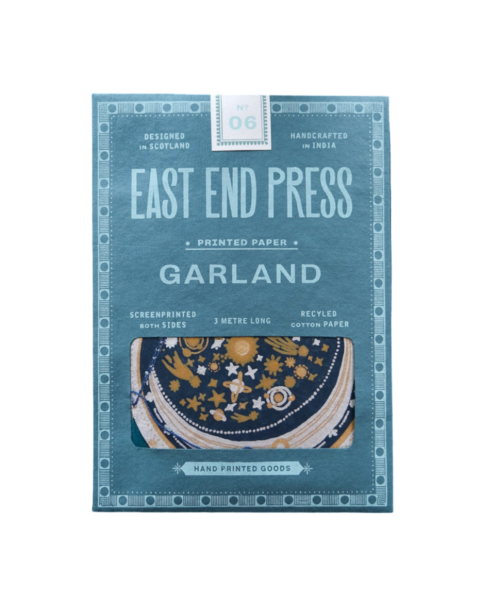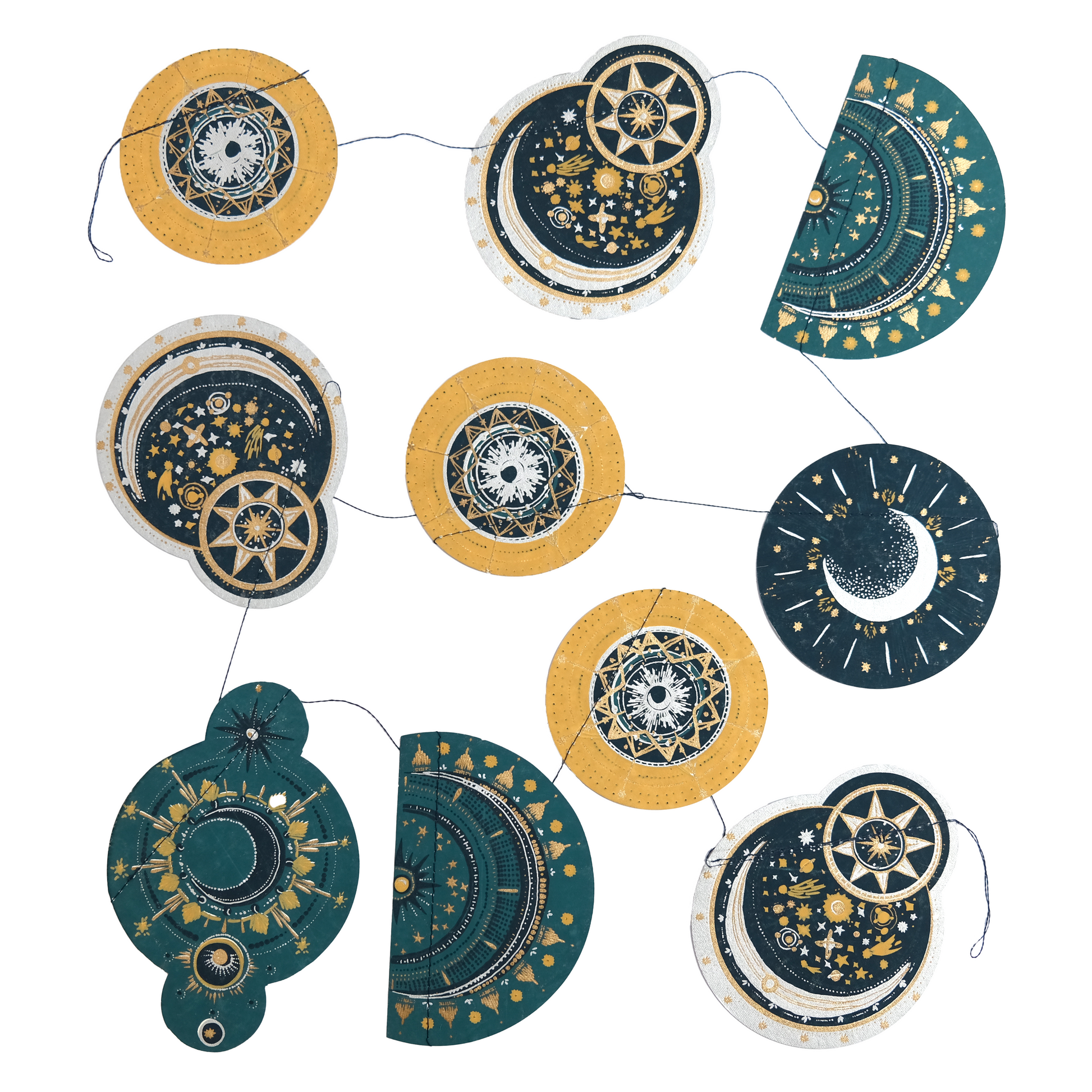A mix of ten planets, stars and moons fill this three metre garland, in deep blues and teals with splashes of metallic inks.