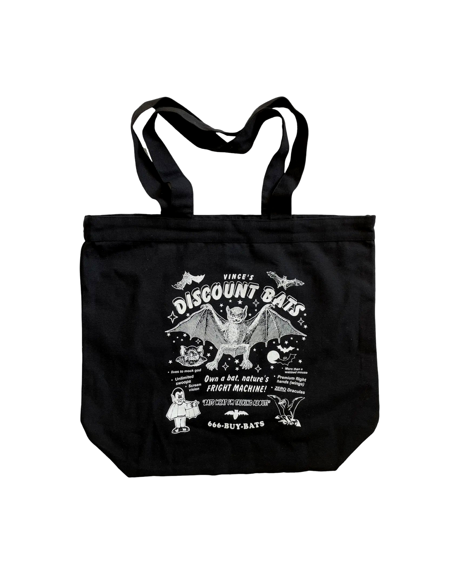 Vince's Discount Bats is your one-stop shop for flying, uh... flying guys. They go floppity-floop? You know the guys I'm talking about. Product specs: * White ink on 100% black cotton * 18″W × 16″H × 6″D * 24″ long black cotton webbing handles * 6″ bottom gusset * Cute little embroidered Arcane Bullshit tag * Premium flight hands