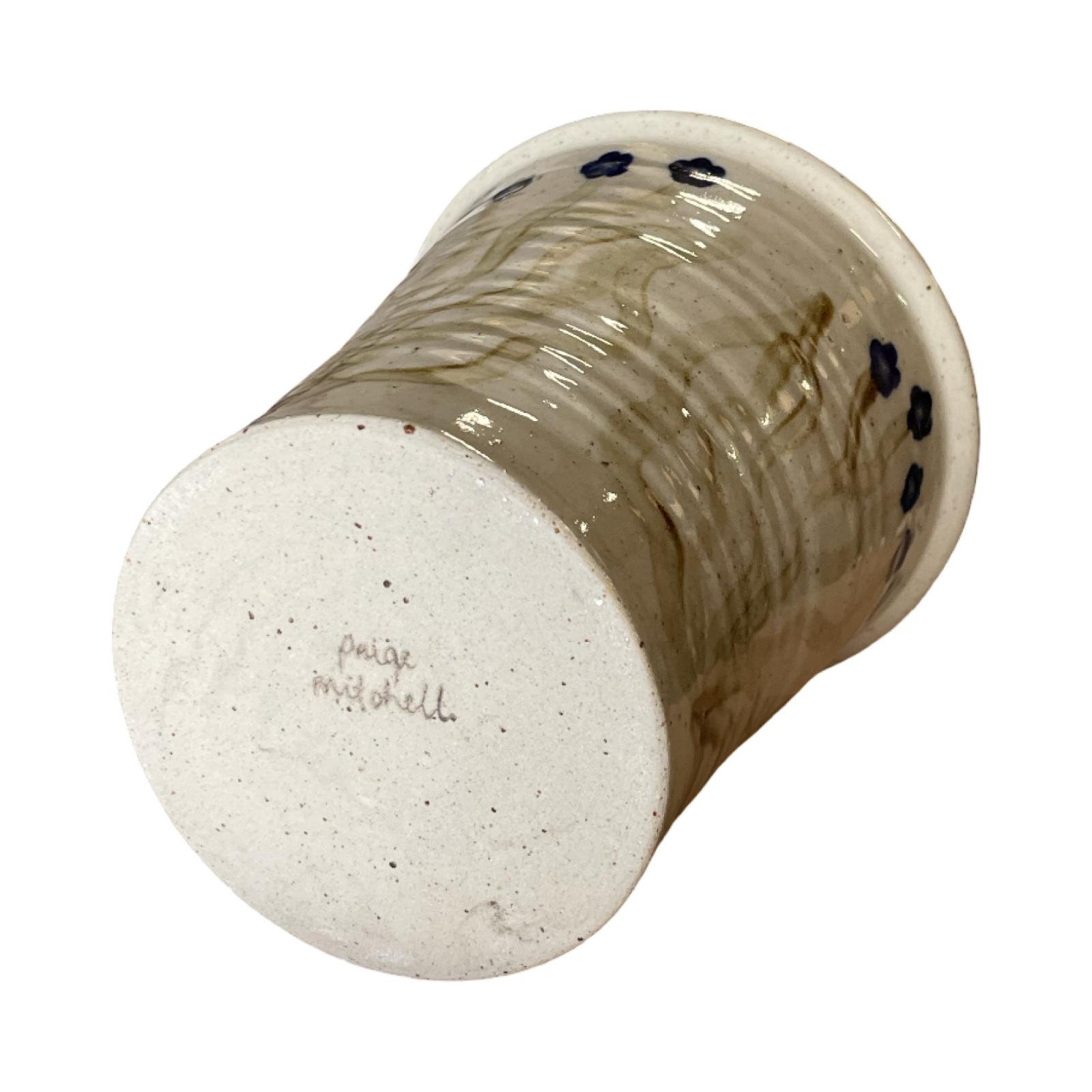Bisque fired once when dry, stamped, waxed and coated in a glossy transparent glaze. The piece is then decorated using various oxides and placed back in the kiln for its final 1240 degree centigrade glaze firing.