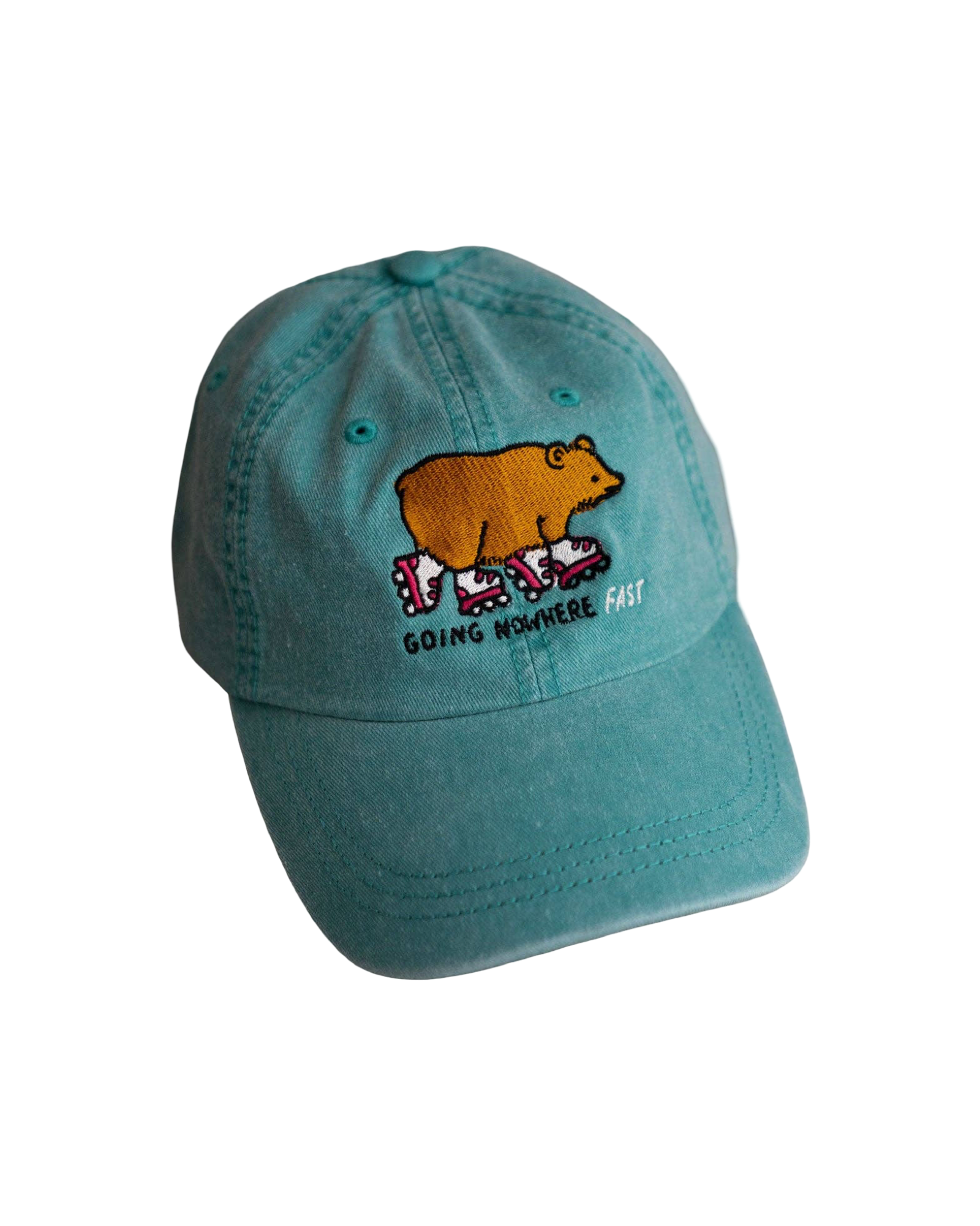 Going nowhere fast! This rollerblading bear is embroidered on a six panel, unstructured, low-profile baseball cap aka dad hat in vintage-look pigment dyed seafoam.